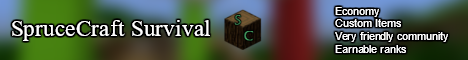Welcome to SpruceCraft! This is a 24/7 survival server, with an economy and a very friendly community. Feel free to join us, we have events and other things, we have mazes & arenas. Anything you like! There's also custom survival items for people that like that.