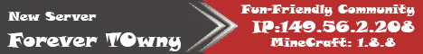 Come and join Forever Towny a brand new 1.8+ Towny server. We offer great plugins such as Towny,Economy,Marriage,Lottery,Jobs and etc.. As a bonus for playing on the server, you can get upgraded for the amount of time you put in. Each rank will get you more permissions such as more /disguises,more pets,more sethomes,other permissions that will help your stay on the server a very enjoyable one and you could even earn /fly and /hat!! Our staff members are very humble, capable and will help you at anytime. Our server is 24/7 so you can play anytime of the day. We hope that we will see you soon!