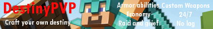 DestinyPVP is a new type of Faction server. Instead of using the generic vanilla minecraft mechanics and weapons, we use custom weapons and armor to give PVP a whole new feeling. We pride ourselves on being unique, and that is what we intend on being. We have friendly staff and a kind community. The best part is, we are able to provide all with NO LAG!