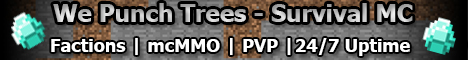 Welcome to WPT Survival, we're a new server with huge potential. The server were operating here is basically a classic vanilla survival server with a twist. The twist being plugins such as mcMMO, and Factions. Great community with mature staff who are knowledgeable and helpful.