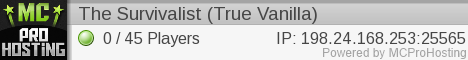 I grew very tired of seeing connection after connection failed in my server feed since people don't know how to download FTB, so here's a great vanilla minecraft server to play on! Enjoy, and happy surviving!