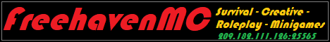 FreehavenMC is a server founded on the premise of player choice. We've created a world that encourages any play style. Whether you want to go off into the world in survival mode and build a farm with friends, head into the city and role play as a store owner, try our custom mini games, lead a nation, build wonders in creative or just plain sight see, the choice is completely yours.