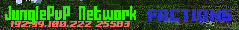 Welcome to the JunglePvP Network we currently have factions sky block prison and pvp we will be adding a lot more stuff as we grow so come join us in the jungle and help us grow bigger.