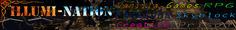 Welcome to Illumi-Nation- A 1.7.2 Multi-World server with the following realms: Vanilla, Mini-Games, RPG, Factions, Skyblock, Creative and Prison!