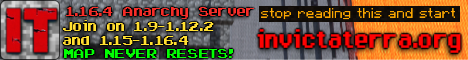 InvictaTerra.org is a NEW Anarchy Server that allows players to join on versions 1.9-1.12.2 and 1.15-1.16.4. Currently the server base consists of 2b2t players that wish to play on an updated version, but have that 2b2t feel. Hack clients are allowed on all acceptable versions, chat is unfiltered, and there are no rules. The Map will never reset and the server restarts every 12hrs. Join the Discord for updates and to connect with players of this community. The server IP is invictaterra.org