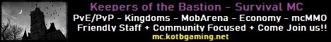 KOTB-MC is an "Enhanced Vanilla" PVE/PVP survival Minecraft server dedicated to community building and lasting friendships. We currently use Kingdoms, mcMMO, Shops, and MobArena to enhance the survival experience and provide a fun and balanced gameplay experience for all players.