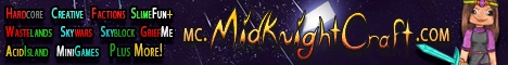 Welcome to MidKnightCraft! This is your one stop for many different Minecraft servers which include Survival Multi Player, Creative, and Hard Core. We also have unique servers like GriefMe; where you can build and distroy builds to your liking. We also have mini game servers like Skyblock, AcidIsland, as well as Skywars. We love to feature custom builds for mini games and servers a like.