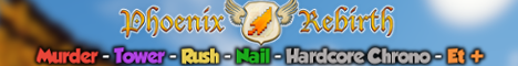 Phoenix-Rebirth est un serveur français en version 1.10/1.11/1.12/1.13 vous proposant de nombreuses Maps PvP connues. Vous pourrez trouver sur le serveur du Murder, du Tower, du Rush, du Nail, du HardCore Chrono, du MonsterIndustrie, du Pile Of Bodies, du CubeControl, du Skywars UHC ainsi que des jeux plus personnalisés comme du TwiceBuild ou du Diablock.
