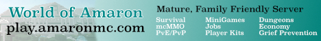AmaronMC is a family friendly, mature, survival server that is adult owned and operated with mature staff members. Our server includes 6 worlds to explore, plus our starting University for new players. Our worlds include: survival/building, resource collection, the nether,the end, mini-games, and a donor only dungeon adventure world.