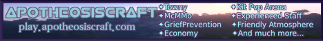 Welcome to ApotheosisCraft ! We're a Towny survival server with experienced staff and a friendly atmosphere! Some of the server features include a kit 1v1 arena, GriefPrevention, Sign Shops, McMMo, and a server Shop with some free goodies! My goal for this server is to make a nice place that's relaxed and fun to play on, so I'm always adding little things to the server, Just for fun. . Some of the basic rules are:
