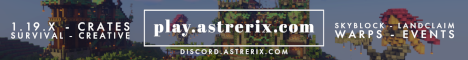 Astrerix is a server created for friends to come together and enjoy Minecraft. We offer survival, creative and skyblock. Besides that we organize fun events for our community with plenty of rewards. The server has landclaims so your builds will be safe for as long as needed, reward crates, and cosmetic plugins such as sitting, laying, hats and more.