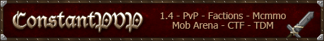 ConstantPvP is a faction survival/pvp server, raiding and griefing is allowed. We have fun mini games; Mob Arena, Team Death Match and the all new Mob Arena Dungeon which is build for 5 players for 30-45 minutes of finding mobs and finding new gear.