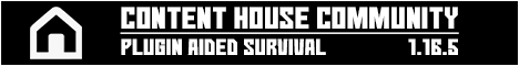 Welcome to the Content House Community Minecraft Server! This is a survival server with many plugins that add an in-depth experience to Vanilla Minecraft. From the added experience provided from MCMMO, to the convenience of TreeFeller and GriefProtection, we can guarantee you a top-notch experience. We are glad to have you, and hope you enjoy the server.