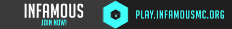 Infamous is the first ever Towny server where the owners develop the server around the players. We are a 100% non-profit server where all funds will go directly to supporting, improving and keeping the server online.