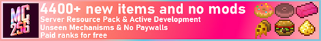 Welcome to MC256.NET Reborn! We have launched open playtesting to help us test out the server before the launch. All your progress will be transferred. We are using a custom resource pack, 5000+ total new items, no mods required, interesting and new mechanics, and also offer paid ranks for no cost!