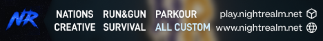 NightRealm is a Minecraft server that has an interesting take on the following gamemodes; Survival - a more modern and harder take on the original Survival experience, sporting a shop, balanced economy, SlimeFun and more. Creative - A way to express your imagination and everyone gets WorldEdit! Parkour - A good place to show your parkouring skills, but you can also submit your parkours. Nations - a realistic geopolitical gamemode which aims to recreate the modern world!