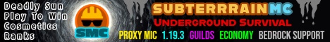 SubterrainMC is an Economy/Survival server that all takes place underground. You need to be creative and find a way to survive without being able to go to the surface because the Sun has become deadly and made the surface inhabitable. You will start in Sapphire Settlement, where you can buy from the market and mingle with other survivors. We have multiple custom plugins that make the experience exciting and give you some quality-of-life items to use while surviving underground.
